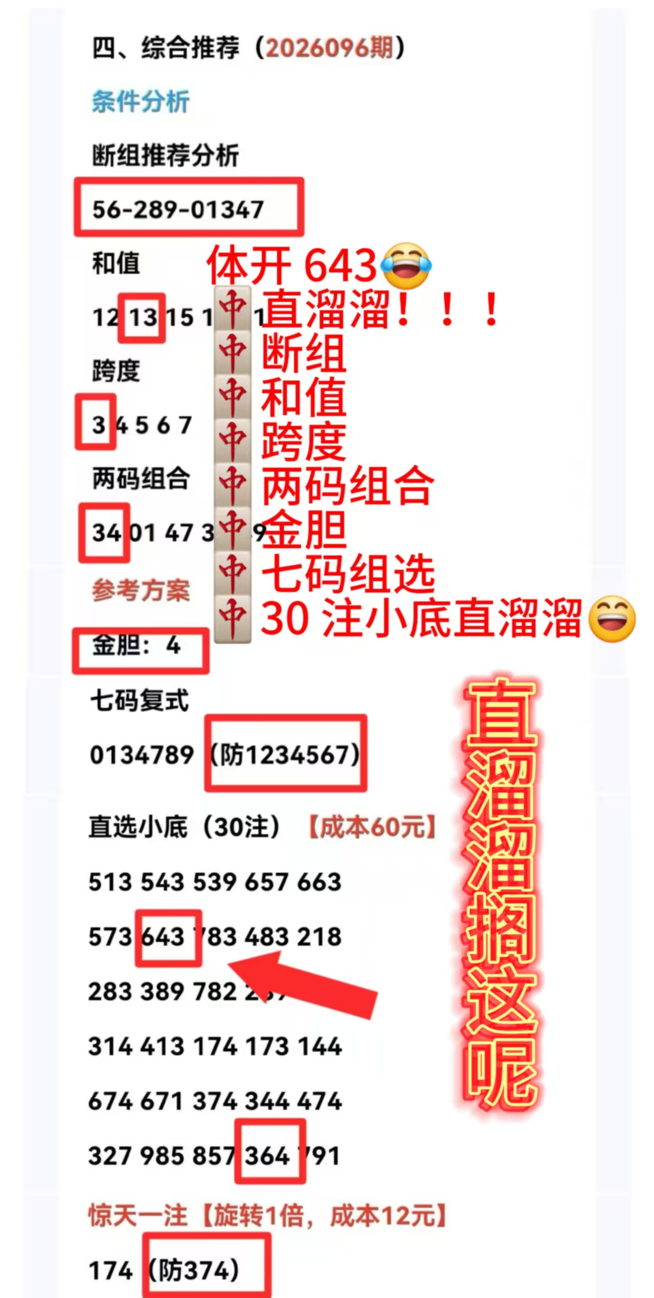 2026096期 命中直溜溜,命中30注小底直溜溜,命中5码定位直选,命中金胆