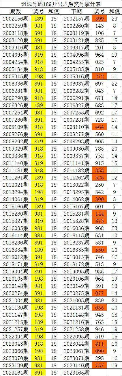 一、上期回顾:福利彩票3D第2023164期开奖结果:奖号为891,奖号和值为:18,奖号跨度为:8。