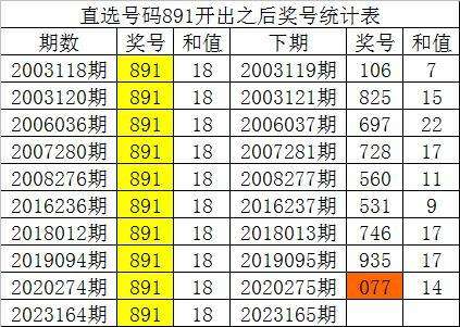 福彩3D第2023164期开出直选号码为:891,该直选号码历史上出现了10次,其下期分别开出了号码:106、825、697、728、560、531、746、935、077,如图: