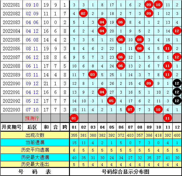 后区分析:上期后区奖号为07+10,本期后区排除重号,四码参考01、03、11、12。