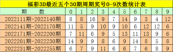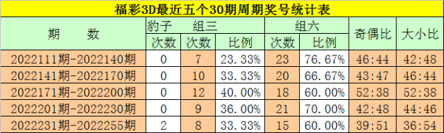 在最近一个30期周期内(第2022231期-第2022260期),组三(含豹子)号码共出现10期,占开奖总数的40%,组六奖号共出现15期,开出比例为60%,组六号码轮空1期,本期重点关注组六号码出现。