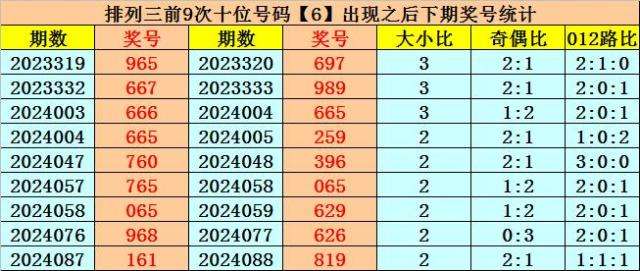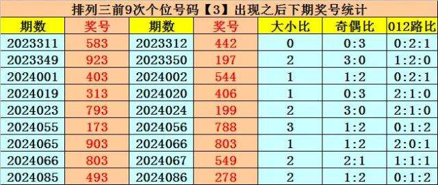 个位前9次开出号码3时,该位下期奖号分别为:2-7-4-6-9-8-3-9-8,其中号码个数大小比是6:3,012路比是4:2:3,奇偶比是4:5。