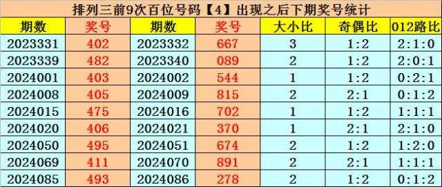 百位号码:百位上期奖号为0路、奇数、小号:4,历史上百位号码4共开出729期,前一次开出期数在第2024085期,上期奖号隔10期再次开出。
