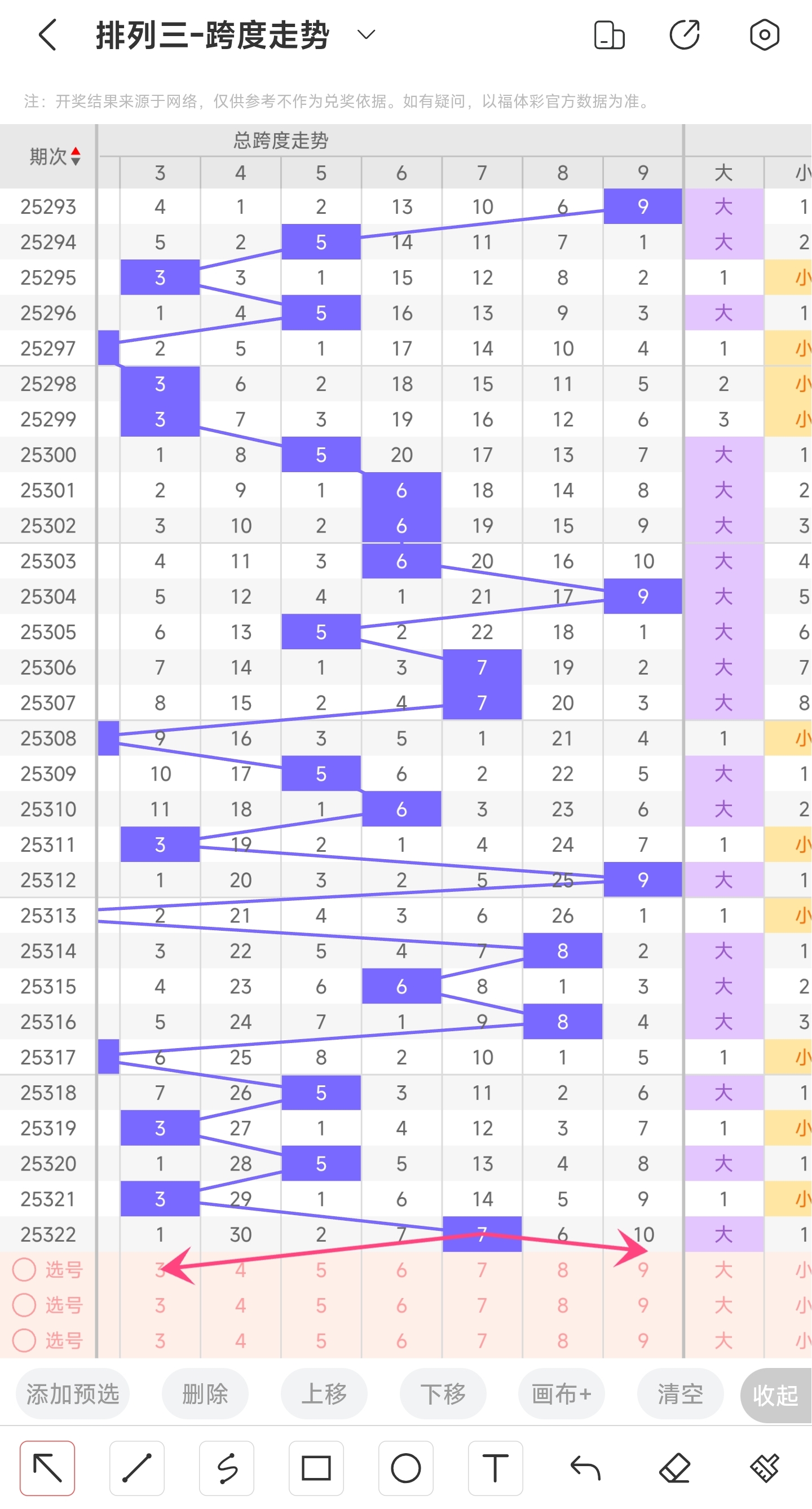 上期跨度为7,往前一期跨度是3,趋势往右移动,偏移量为4。跨度值7时,跨度值是近30期内开出比较大的值。通过走势图分析,目前的趋势是大概率往左,小概率往右。所以推测本期跨度可能为23589等跨度。