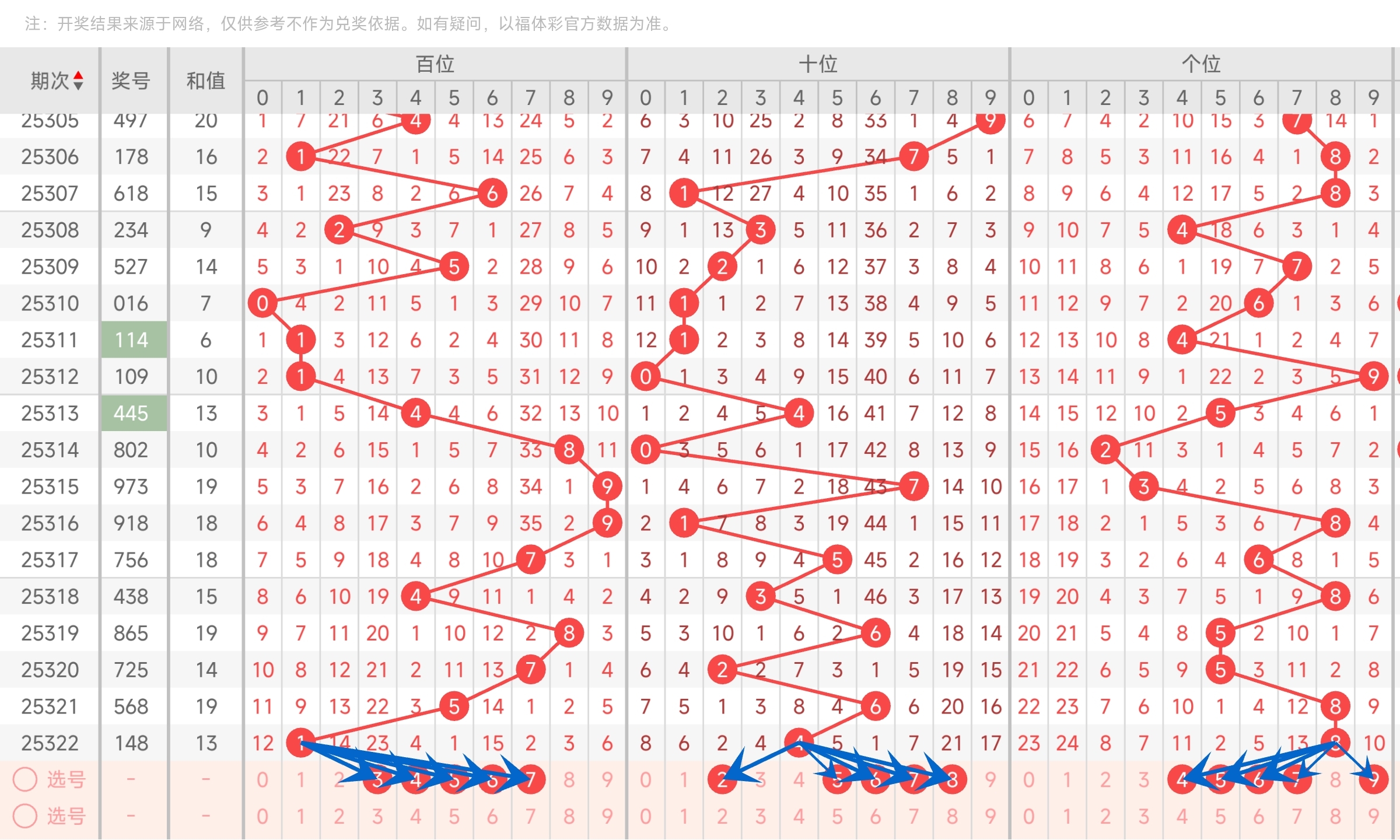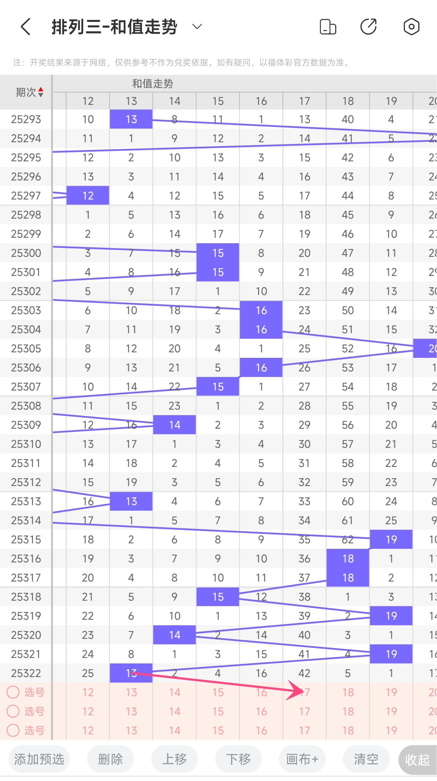 上期和值为13,往前一期和值为19,趋势往左移动,偏移量为6。通过走势图分析,13和值是近30期内开出比较小的和值,下降空间比较小,上升空间比较大。本期看好和值变大,因此推测本期趋势是往右的,和值会变大,小概率往左,和值变小。