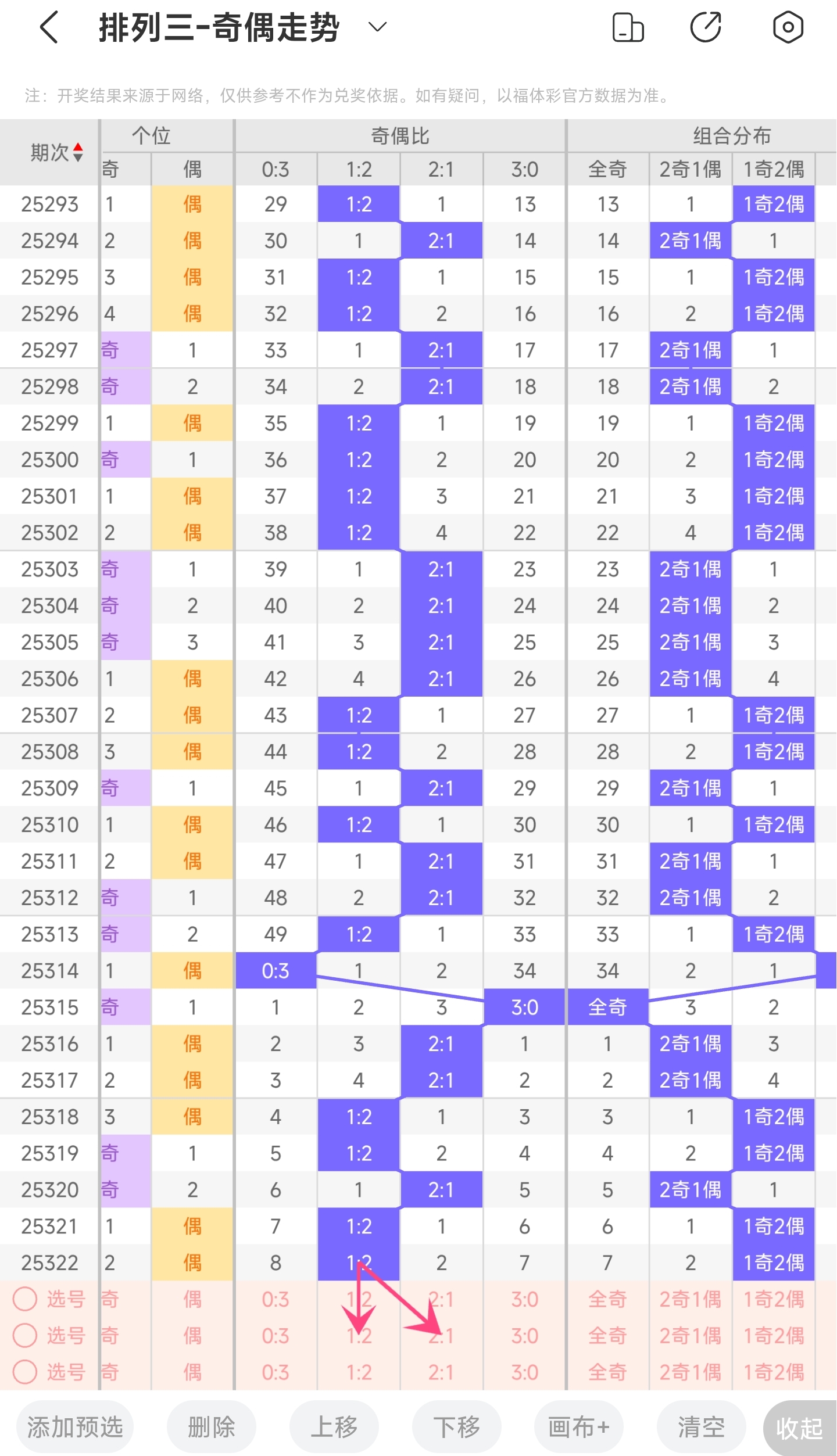 上期开出了1:2的奇偶比。往前一期是1:2奇偶比。通过分析奇偶走势图,近30期内开出1:2奇偶比的次数是15次,开出2:1奇偶比的次数是13次,3:0是1次,0:3是1次。和前一期相比,1:2次数变多,2:1次数变少。通过走势图分析,可以就看到1:2连续开了2期,本期看好2:1奇偶比。所以推测本期可能开2:1奇偶比,其次是1:2奇偶比,最后是3:0或者0:3奇偶比。