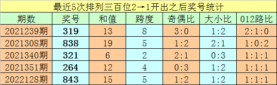 1、排列三最近两期百位号码分别开出2和1,历史上百位号码连续两期分别开出2和1的奖号出现了51期。前五期开出之后其下期奖号分别为:319、838、321、264、843;