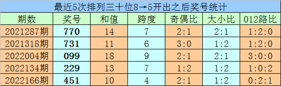 1、最近两期排列三十位号码开出号码分别为8和5,历史上十位号码连续两期同时出现号码8和5的奖号共开出62期。最近五次下期开出号码为:770、731、099、229、451;