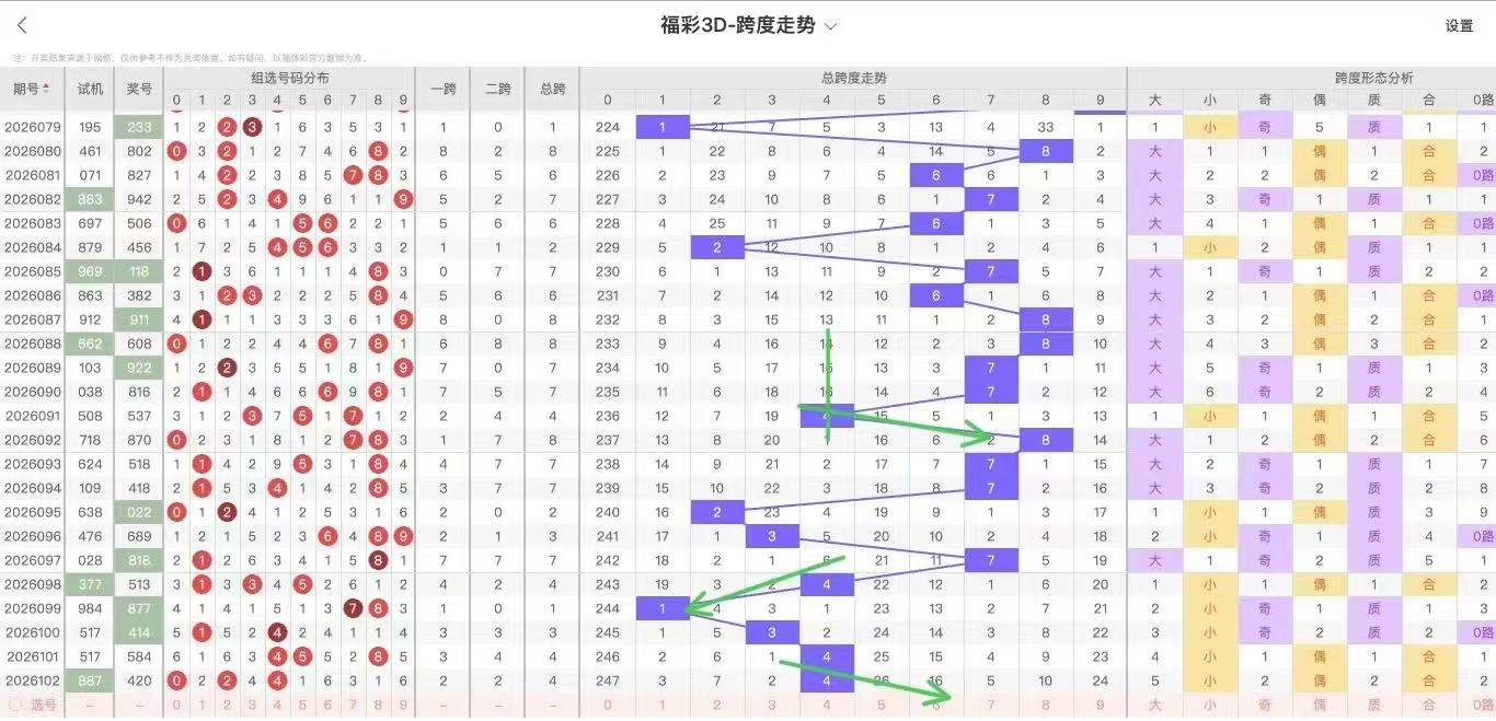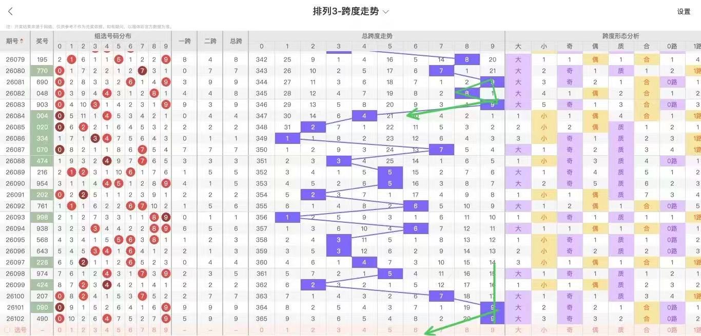10期内跨度走势为:1-6-3-3-4-2-7-2-9-9,10期内大小跨比为5:5,奇偶跨比6:4,百期内跨度9共开出11次,下期数据:6 3 4 6 7 9 7 8 4 9近期较热,考虑跨度9开出后容易出大跨度,近期大小规律大:奇:质,所以接下来继续小跨,奇跨度表现!