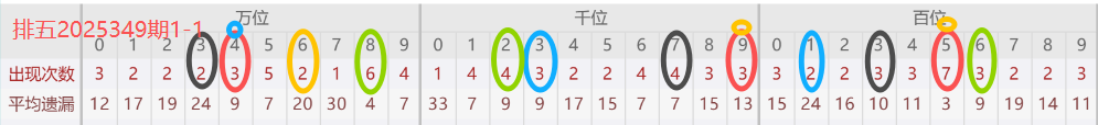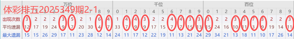 下图所圈出的为近30期各位置所出现的热码出现次数及平均遗漏值,用以参考和一些冷码组合选号。