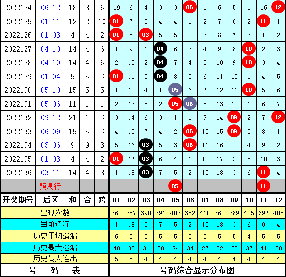 后区分析:上期后区奖号为03+11,本期后区注意重复号码出现,大范围参考号码02、04、05、11。