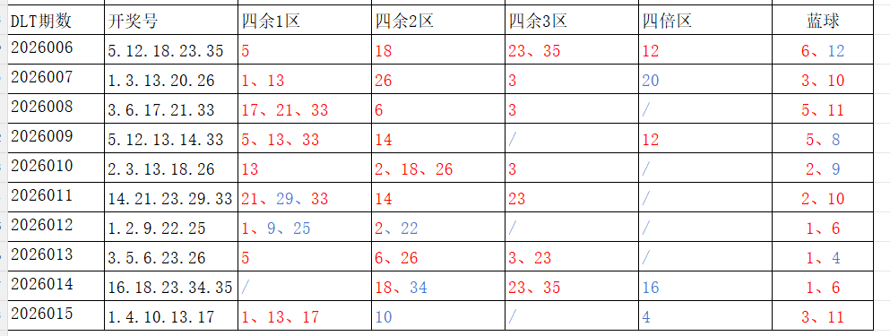 分享第一个数据分析:四分区统计数据。相对于传统的三分区,个人习惯使用四分区,就是把35个红球号码除以4,所得的余数分区如下: