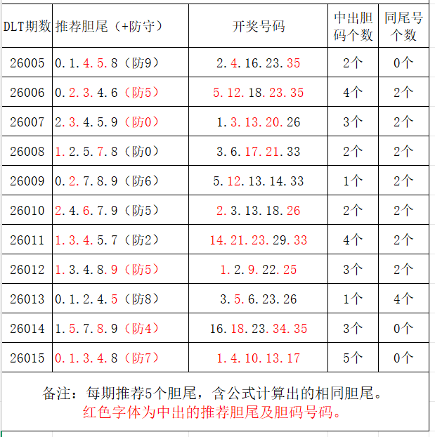 如图,每期推荐胆尾中出1-4个。上期推荐胆尾中出5尾5码!推荐胆尾是按照公式计算的顺序,不定位红球号码的顺序。本期推荐胆尾:0尾/2尾/1尾/3尾/5尾,加推防守胆尾+胆码号码:***(会员专区可见)。个人分析,仅供参考。