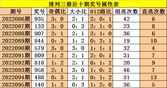 上期回顾:体彩排列三第2022095期奖号:140。,奇偶比1:2,大小比0:3,012比1:2:0。