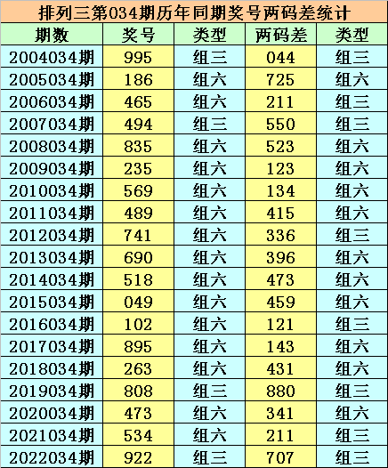 在历年开奖中,两码差开出年限分别为:1、3出现9年,4出现8年,2出现6年,5出现5年,0出现4年,7出现3年,6、9出现2年,8出现1年,第2023034期预计两码差出现:3、4、7。