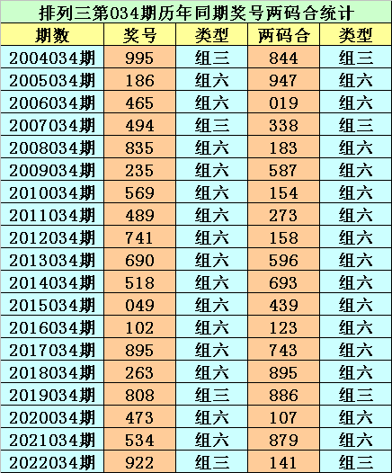 排列三从2004年开奖至今已开出6454期奖号了,其中第034期历史同期奖号出现19次,历年第034期分别开出号码:995、186、465、494、835、235、569、489、741、690、518、049、102、895、263、808、473、534、922。