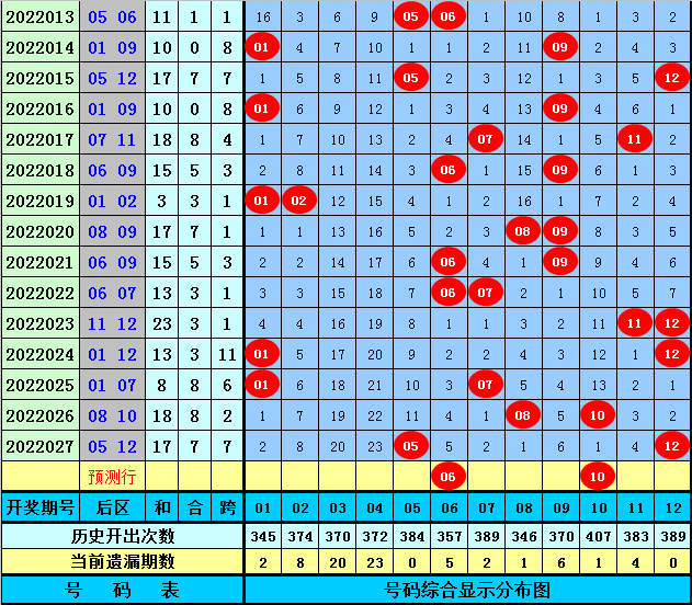 后区分析:上期后区开出一大一小组合:05+12,最近10期后区奖号大小比为12:8,本期防一大一小组合再出,参考两码06、10。