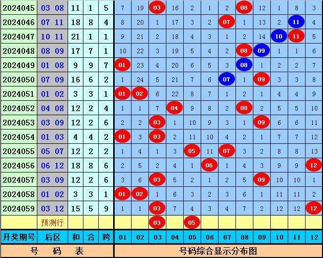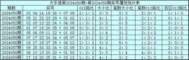 5、后区奖号分析:最近9期后区号码012路比为9:5:4,其中012出现期数分别为:6期,6期和4期,上期后区奖号为03和12本期看好1路走冷,关注号码03、05、07、09、12。