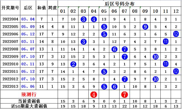 后区走势分析:最近五期后区号码分别开出大大、小大、小大、大大、小小,小大组合走势相对较热,本期预计小大组合开出,后区参考04 07