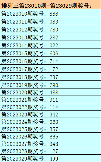 1。排列三最近十期分别开出号码:488-911-114-342-060-357-665-348-127-499,其中有3期奖号开出了上期的重复号码,本期预计第2023029期奖号:499中有重号,参考号码:4。