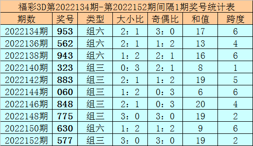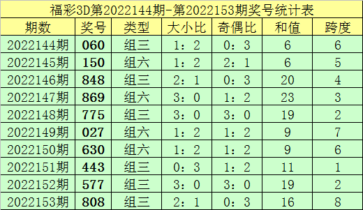 其中大小比2:1,奇偶比0:3,和值16,跨度8。