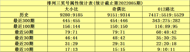 上期回顾:排列三第2022085期奖号为279,奖号012路比为1:1:1,奇偶比为2:1,大小比为2:1,和值为18,跨度为7。