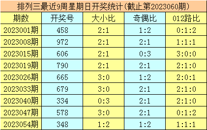 三、体彩排列三前9周星期日奖号分别开出:458-972-606-790-665-679-334-578-348,其中号码012路比为13:7:7,奇偶比为13:14,大小比为18:9;