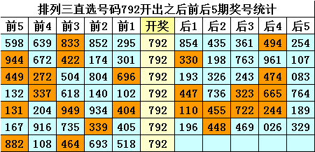 四、排列三直选号码792历史上开出7次,其前后五期奖号分别为: