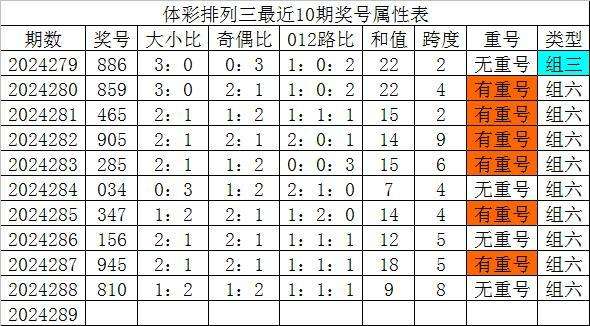 体彩排列三最近10期分别开出奖号:886、859、465、905、285、034、347、156、945、810,各奖号属性详见下表: