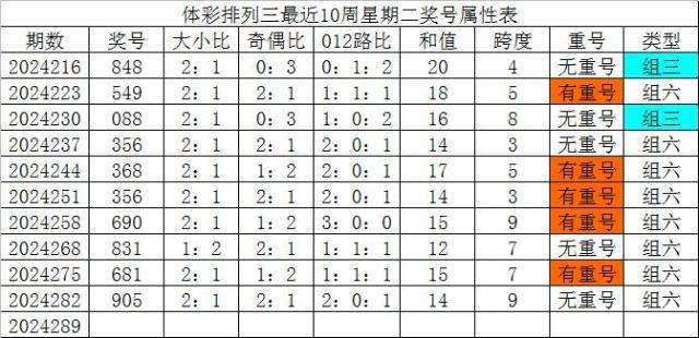 体彩排列三最近10周星期二奖号分别为:848、549、088、356、368、356、690、831、681、905,各奖号属性详见下表: