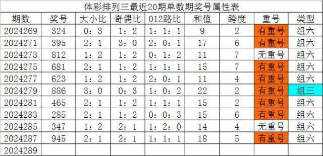 体彩排列三最近20期单数期奖号分别为:324、395、812、681、623、886、465、285、347、945,各期奖号详细属性下表:
