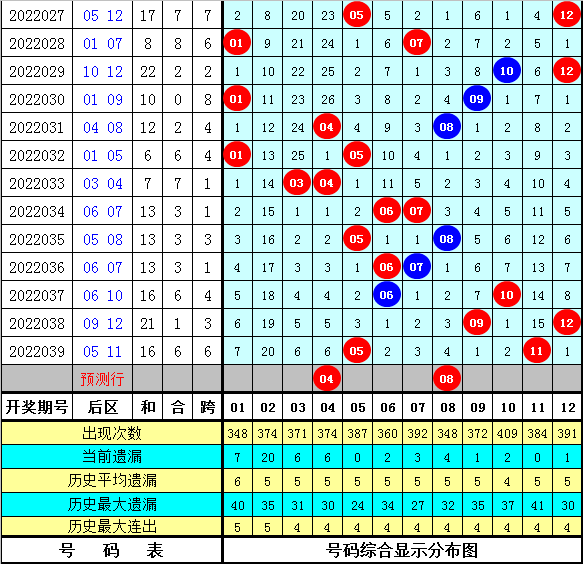 四、后区分析:在040期历史同期开奖中,后区全大组合开出3次,全小组合开出5次,一大一小组合开出7次;后区全奇组合出现5次,全偶组合出现1次,一奇一偶组合出现9次。后区本期偶数火爆,注意全偶04、08。