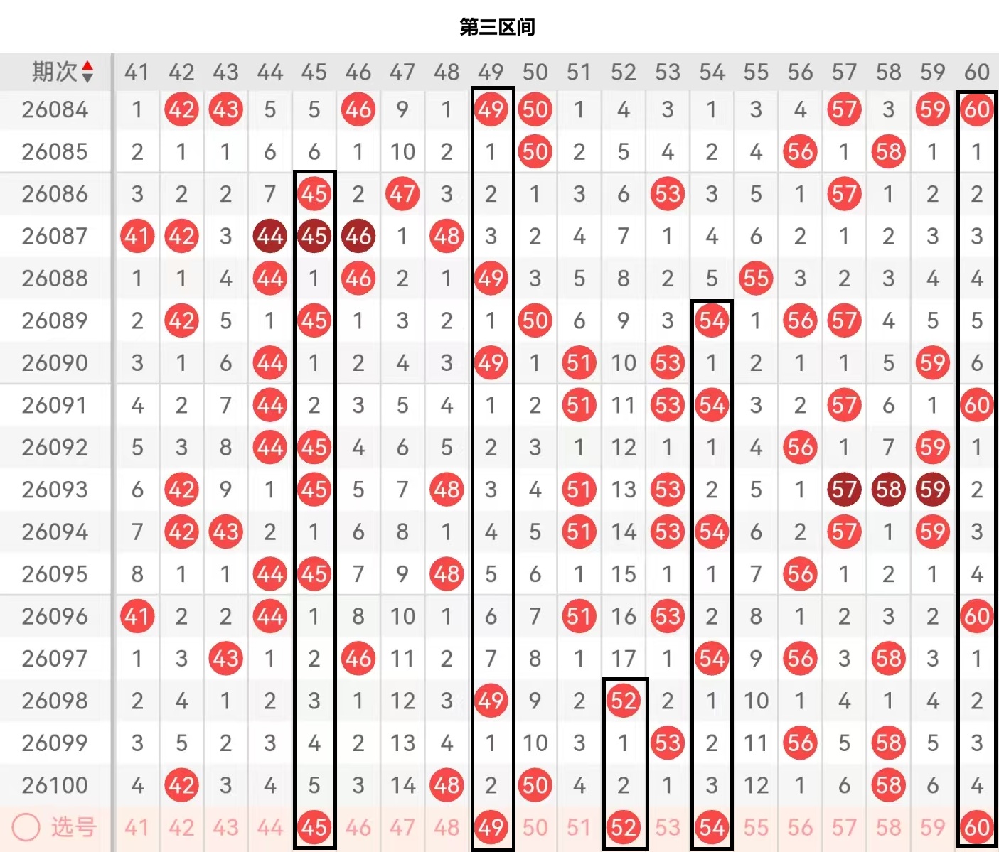 上期第三区间开出了(52 48 50 58)四个号码球,上期三区间开出温态四码落位,上期三区号码落位处于区间的前后端。区间前端独码52号码球开出,那么通过对三区间的整体分析来看我认为接下来三区间号码在区间走出震荡后形成下行落号。那么大家一定要注意区间号码的冷调整趋势,区间后端独码58号码球开出,通过对三区间近期号码的分析来看号码走出温态调整的可能性最大。那么通过分析来看三区间在近期会继续出现走势分化的趋势,因此我们在对三区间进行分析后得出,未来我们要重点考虑近期回补号码球更为妥当。