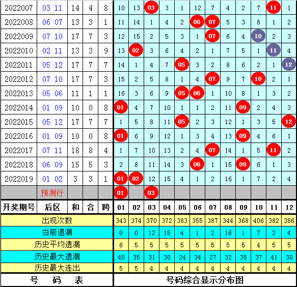 大乐透历年同期第020期后区尾数奇偶比为16:14,最近5年尾数奇偶比为5:5,后区尾数大小比为15:15,最近5年尾数大小比为5:5,本期后区注意号码01、03、08、09、11,后区两码关注01、03。