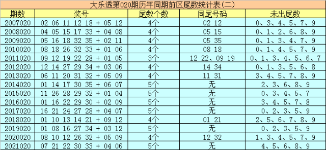 在大乐透第020期历年同期奖号中,前区后三位尾数出号频次分别为:尾数2出现10个,尾数7、8出现5个,尾数0、3、4、9出现4个,尾数1、5、6出现3个。其中尾数数字三类型豹子、组三、组六次数比为0:1:14,今年同期后三位尾数类型参考组六;