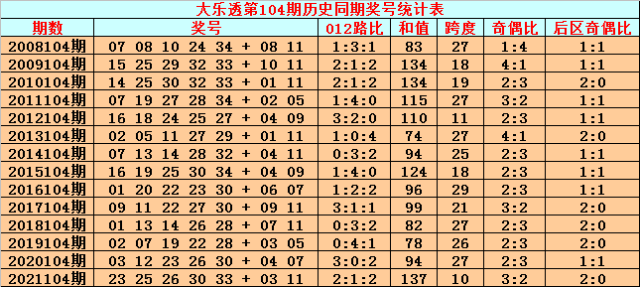 综上所述,大乐透第2022104期前区012路比参考1:2:2。