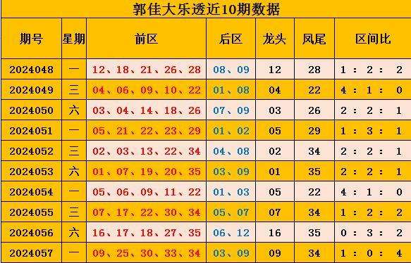 058期郭佳大乐透预测奖号:龙头凤尾区间比分析