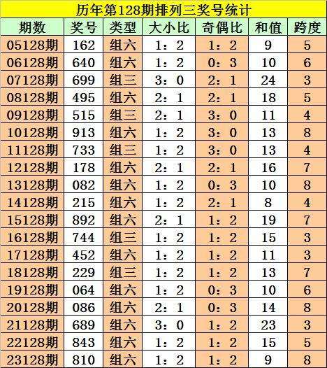 排列三第2023128期奖号:810,和值9,跨度8,大小比1:2,奇偶比1:2。