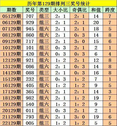 历年第129期奖号中:组三开出8次,组六开出10次。组三、组六基本相当,本期关注组六。