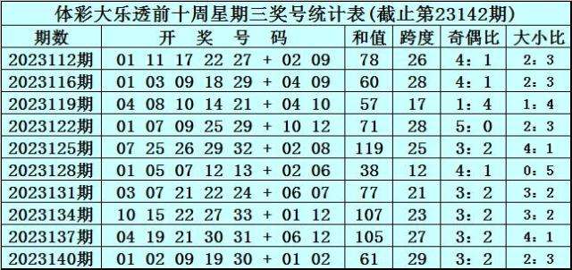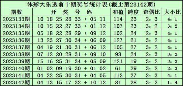 体彩大乐透第23142期奖号为:04 13 15 17 32 + 10 12。前区奖号和值为81,跨度为28,奇偶比为3:2,大小比为1:4。后区奖号和值为22,跨度为2。