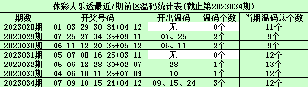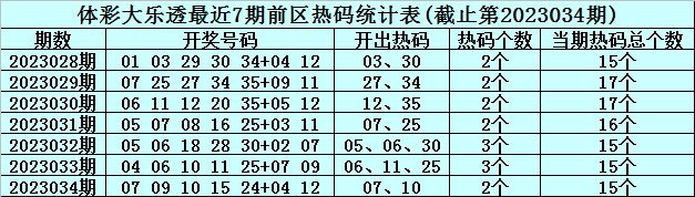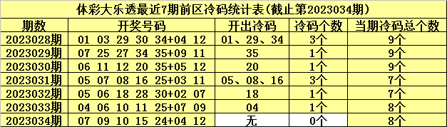 体彩大乐透第2023035期前区冷温热号码分析:(定义:遗漏0-3期号码为热码,遗漏4-9期号码为温码,遗漏9期以上号码为冷码)