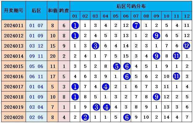 跨度分析:上期后区跨度为4,与前期相比上升3点位,预测本期跨度走势变化不大,推荐两码跨度1--5
