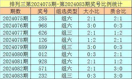 上期回顾:排列三第2024083奖号开出232,奖号质合比为3:0,大小比为0:3,跨度为1,类型为组三。