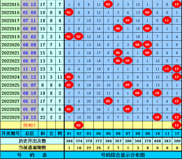 后区分析:上期后区奖号为10和12遗漏期数分别为2期和1期,目前后区遗漏5期以内的热码有6个:01、05、07、08、10、12,遗漏4期以上的热码有6个,本期后区适当关注重号出现,参考两码02、12。