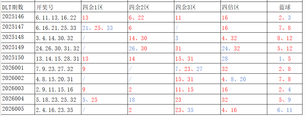 分享第一个数据分析:四分区统计数据。相对于传统的三分区,个人习惯使用四分区,就是把35个红球号码除以4,所得的余数分区如下: