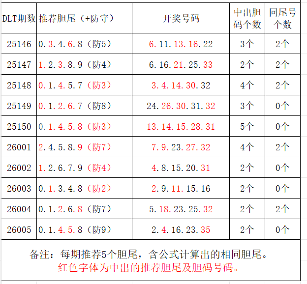 如图,每期推荐胆尾中出1-4个。上期推荐胆尾中出2尾2码!推荐胆尾是按照公式计算的顺序,不定位红球号码的顺序。本期推荐胆尾:2尾/4尾/0尾/6尾/3尾,加推防守胆尾+胆码号码:***(会员专区可见)。个人分析,仅供参考。