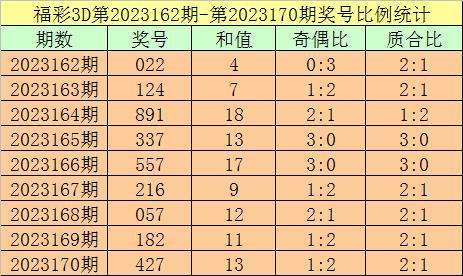 开奖回顾:福彩3D第2023170期:奖号为427,奖号质合比为2:1,大小比为1:2,跨度为5,类型为组六。