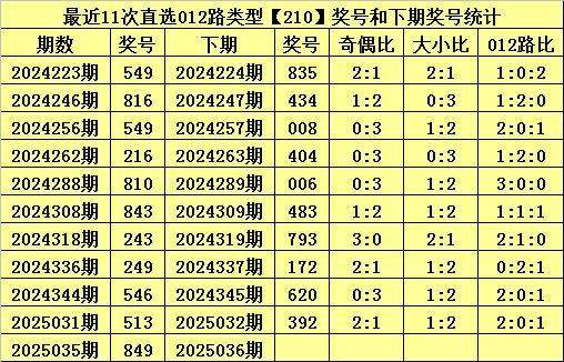 排列三上期开出奖号为:849,其直选012路类型为210,历史上直选210号码已开出了241次,最近11期分别开出奖号为:549、816、549、216、810、843、243、249、546、513、849。