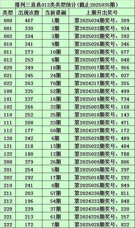 上期回顾:体彩排列三第2025035期开出奖号:849,其012路比为1:1:1,奖号012路类型为:210。