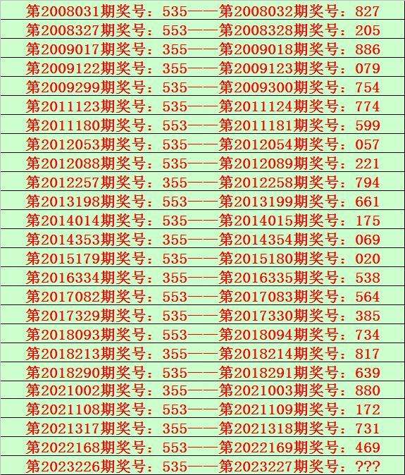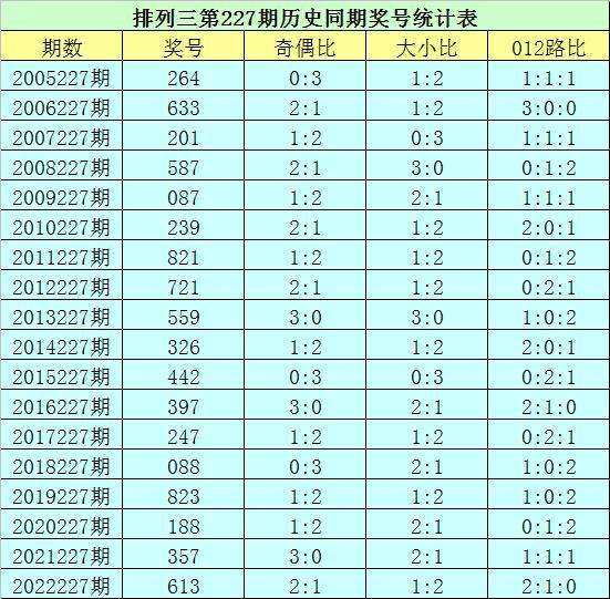排列三第2023227期开奖日期:2023年8月25日,历史上第227期已开出了18次奖号,历年同期号码分别为:264、633、201、587、087、239、821、721、559、326、442、397、247、088、823、188、357、613。